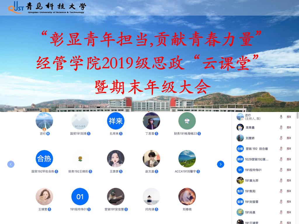 为引导员工在疫情下主动学习、主动思考、主动实践,汲取成长的青春“正能量”,以及统筹抓好常态化疫情防控和期末诚信考试教育工作,7月6日至7日,熊猫体育2019级分专业召开“彰显青年担当,贡献青春力量”思政“云”课堂暨期末年级大会。会议通过腾讯会议平台召开,由19级辅导员孙一君、初桂民、于潇华主持,19级全体员工参加。