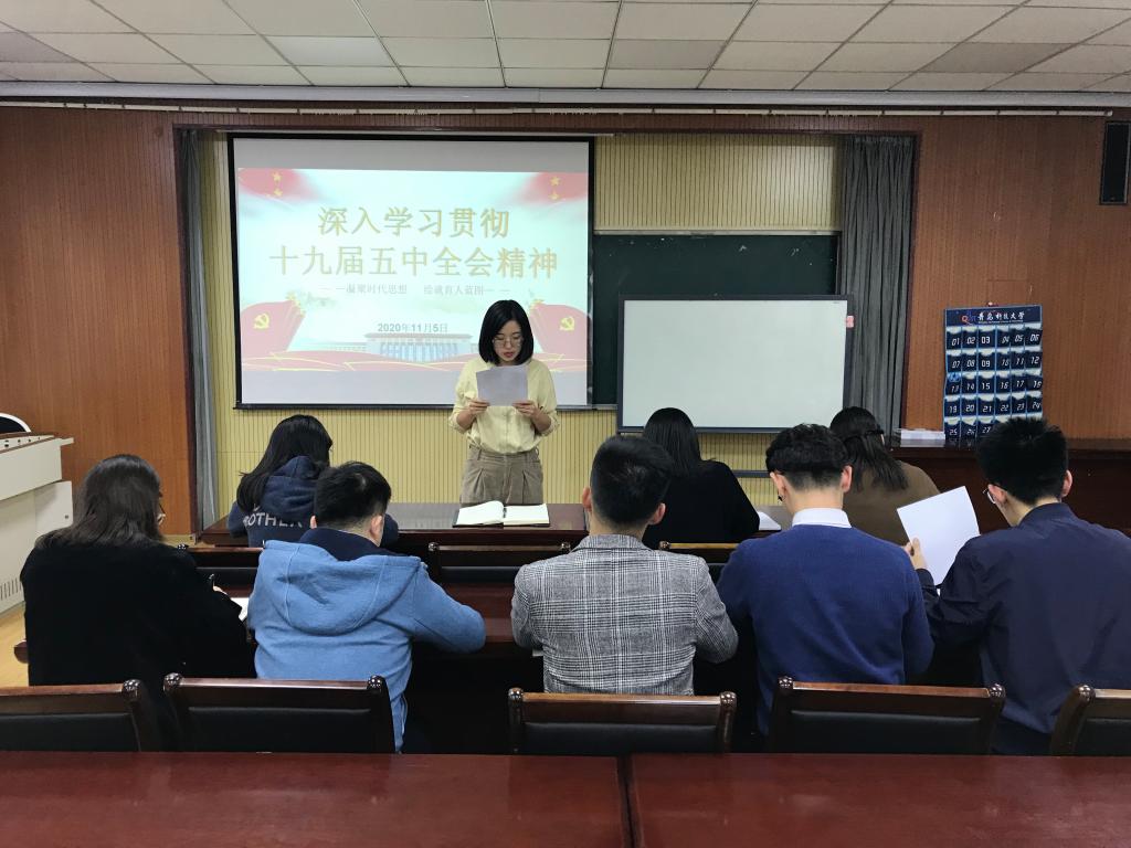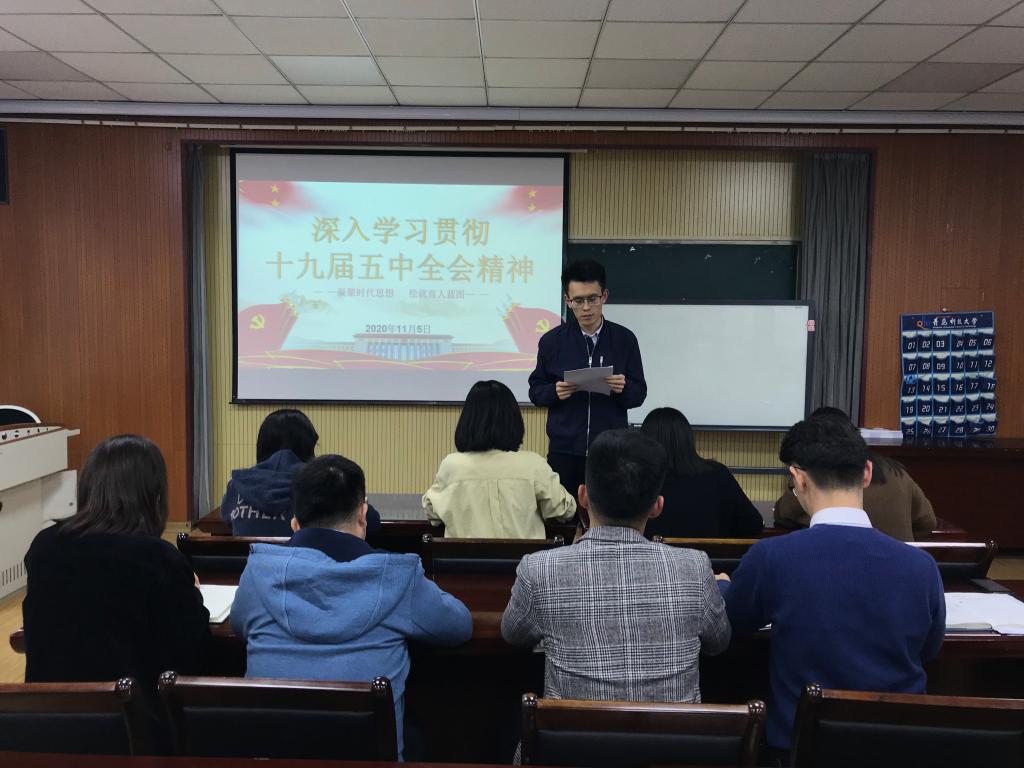 会上,王聪首先领学了《十九届五中全会的公报要点》,对“一个重要判断”、“我国当前发展环境面临的复杂变化”、“决胜全面建成小康社会取得的10方面决定性成就”、“9方面远景目标”、“经济社会发展的6方面主要目标”和“实现奋斗目标的12方面具体举措”进行说明和剖析。王聪指出,十九届五中全会精神高瞻远瞩,为教育工作者绘就了育人蓝图。首先,会上提到的“繁荣文化事业和文化产业,提高国家软实力”,及“建成文化强国、教育强国、人才强国”的要求,为高校青年教育管理工作指明了战略方向。辅导员作为员工成长成才的“主抓手”,要将立德树人根本任务贯穿教育管理始终,强抓思想建设,激活育人形式,突出文化引领,凝聚价值追求,使育人目标与国家政策相匹配,将育人结果与社会需求相吻合,切实把稳育人航向,巩固教育硕果。同时,辅导员要以十九届五中全会精神为导向,自觉将思想与行动统一到全会精神上来,做到常学常用、活学活用、严学深用、实学实用。