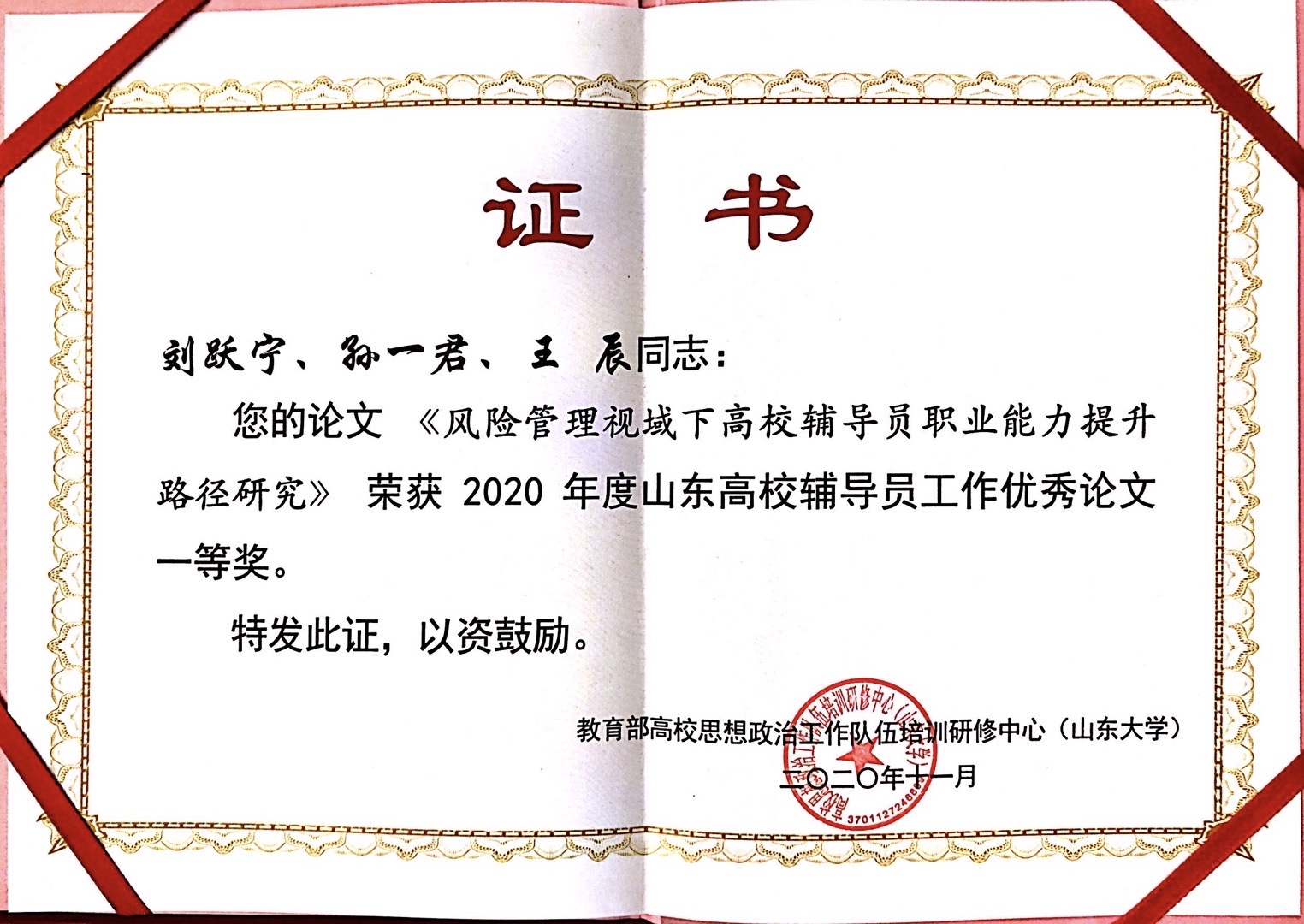 论坛对2020年山东高校辅导员工作论坛获奖论文进行了表彰。全省200余所高校(含高职)推荐的1000余篇论文共有97篇论文获奖(其中一等奖20篇,二等奖33篇,三等奖44篇)。公司共有3篇论文获奖(其中一等奖2篇、二等奖1篇),由公司刘跃宁、孙一君、王辰撰写的《风险管理视域下高校辅导员职业能力提升路径研究》,张显全、王聪、张晓帆撰写的《高校老员工网络思想政治教育应对重大突发公共事件有效性量化研究——基于层次分析法的模糊数学综合评价模型》两篇论文获得一等奖,获奖数量和质量均有重大突破。