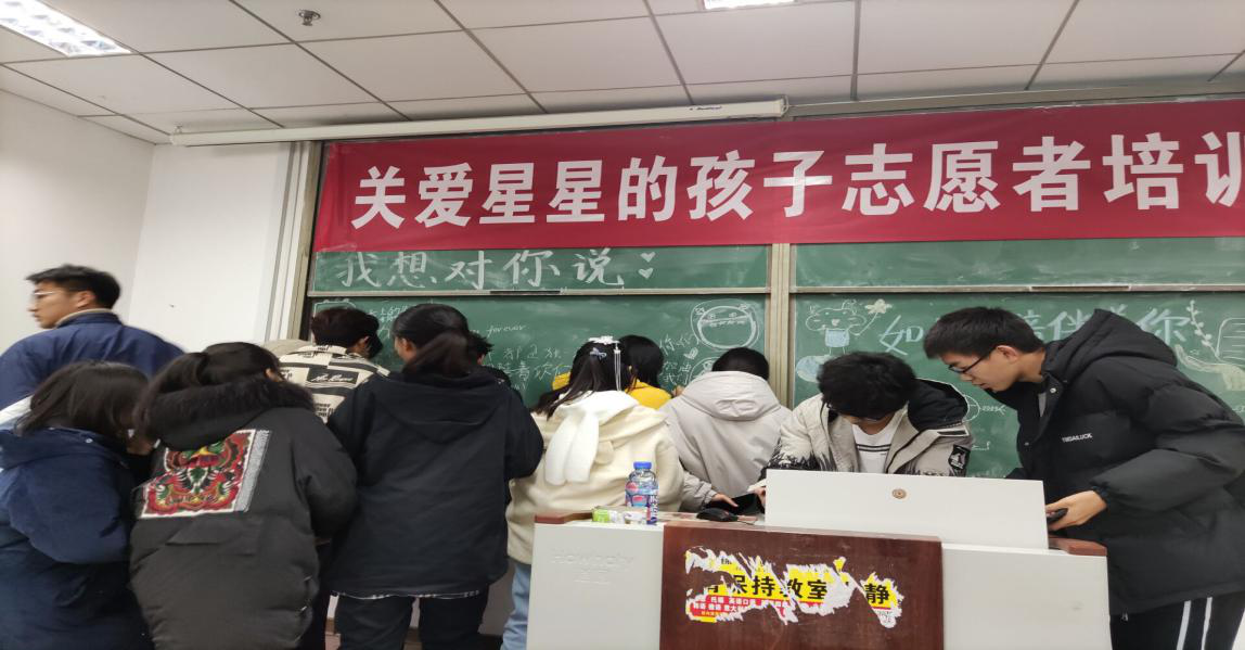 在志愿者培训结束后,在场的志愿者们积极和高老师交流,同时在黑板上留下了对“星星的孩子们”想说的话,给予他们精神上的鼓励,“你是小天使”,“我们陪着你”温暖而又感动。