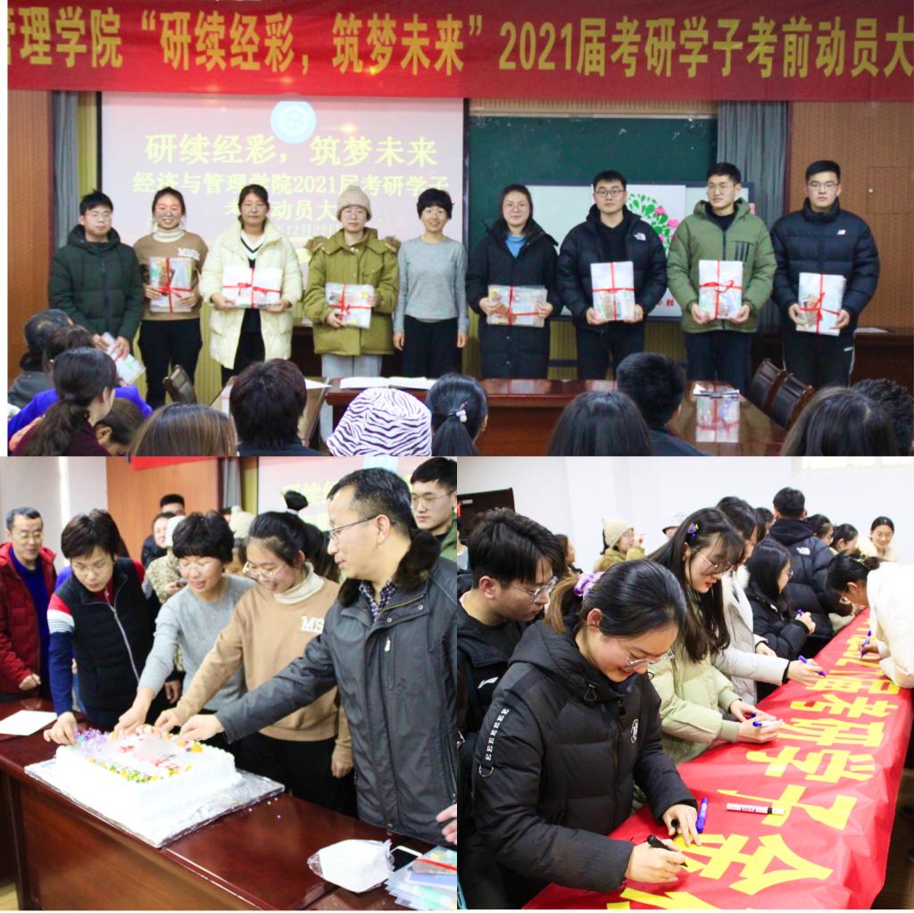 12月22日下午,熊猫体育“‘研’续‘经’彩,筑梦未来”2021届考研学子考前动员大会于经管楼419正式召开。熊猫体育副经理宫攀、各系主任、2017级辅导员及考研员工代表参加动员会。会上,各专业考研员工代表依次汇报了近期复习状态及备考情况,员工们从报考院校专业、复习历程、心理状态、学习方法等角度进行汇报,与会老师分别为考研员工做考前动员和祝福,从复习建议、心态调整、精神砥砺等角度系统做出具体指导。同时,公司还为全院300余名考研学子赠送“考研加油包”、准备“祝福蛋糕”,以考试专用文具、专属定制照片、温馨祝福帖等细节服务打造坚实后盾保障,助力学子旗开得胜、勇折桂枝。