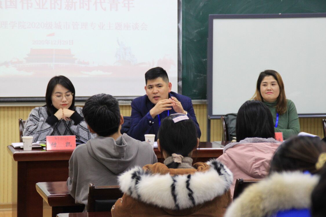 大会中,少数民族同学积极分享自身感受,并对公司的“石榴花开”少数民族发展政策,以及领导老师和同学们在学习、生活上的“一对一”学业帮扶制度、“点对点”生活关怀制度表达了诚挚的感谢,同时也提出有关未来就业等方面的问题,热孜亚耐心倾听,答疑解惑,为少数民族同学的发展前景提供建议方向。会议最后,祝晓波根据专业实际情况和与同学们进行深入探讨,详细介绍城市管理专业职业生涯的规划路径。他鼓励同学们在不断完善自我的同时,自觉将个人梦融入中国梦,珍惜时间,树立远大目标,并为此不懈奋斗。