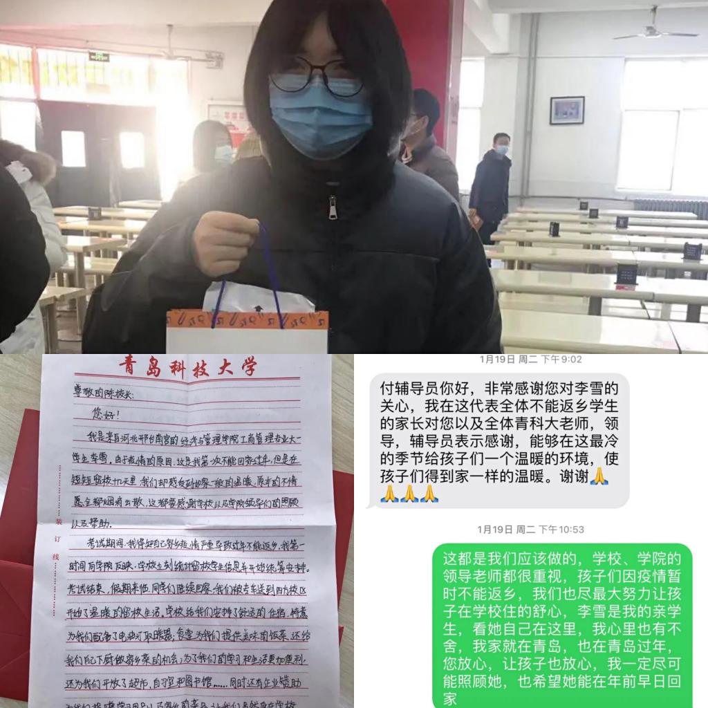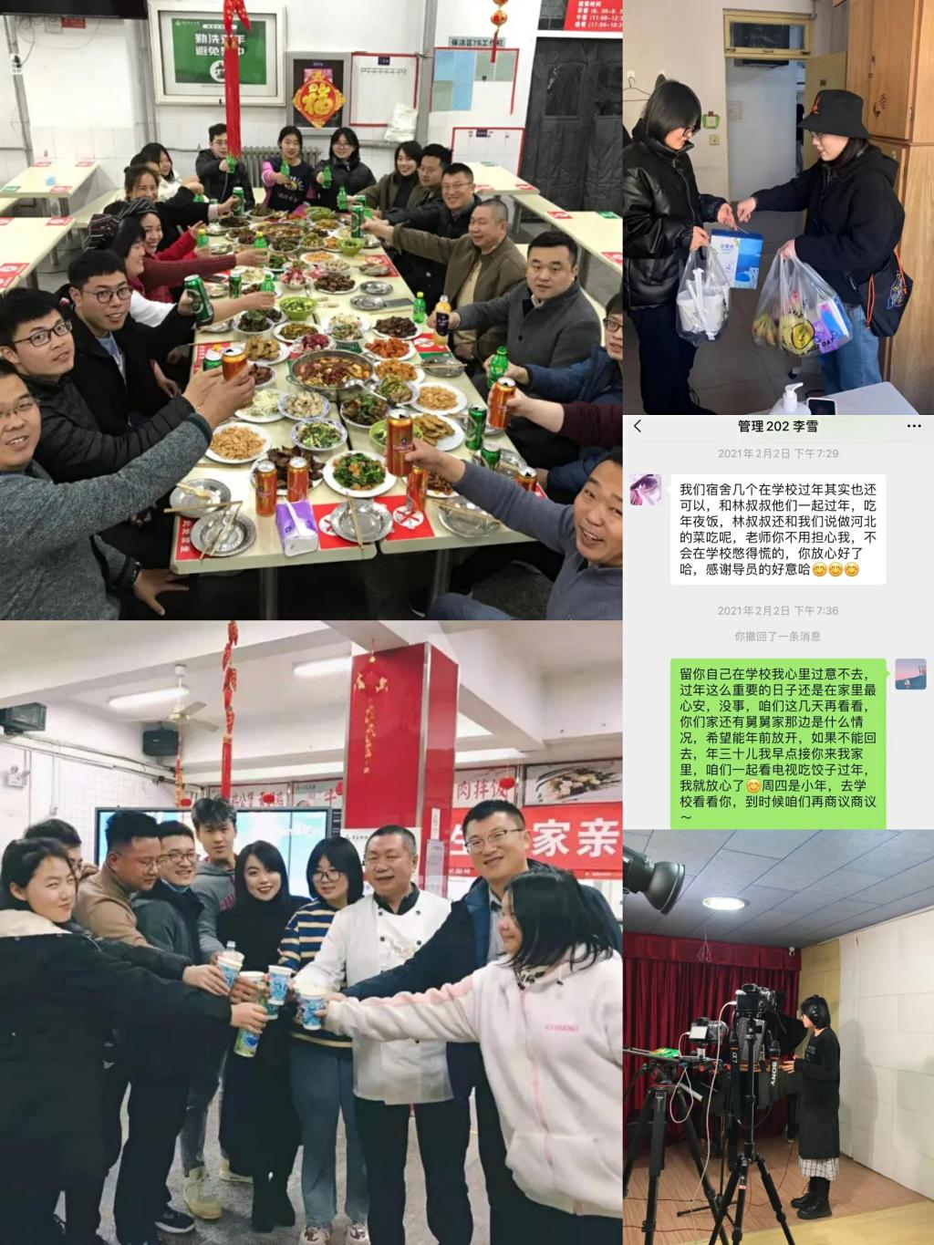 建立院领导-辅导员-班主任-党团骨干“四线联络”机制,实施家校合作“3个1”计划,即:每日1次线上联络员工、每日1次员工安全反馈、每周1次与员工家长视频通话,及时协调解决员工在生活、学习、实践等方面的实际困难。公司领导、辅导员驻地值班,在小年、除夕、正月十五等节日当天到校看望员工并聚餐,送去祝福礼包,让“不能回家”变成“留在家里”。此外,公司辅导员还与员工一同参与了青科大留校师生版本《一封家书》的MV录制,道出万千就地过年学子的心声,也同样为他们注入了与家乡亲人共同抗疫的强大精神力量。