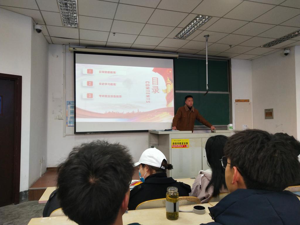本次会议从校园防疫安全、考研就业、爱党爱国教育准备三个方面展开。在日常校园防疫方面,两位老师和同学们强调了现阶段防疫工作的重要性,要求大家结合下发的公司春季学期防疫材料规范请假程序、保持宿舍卫生、注意身体健康,坚持每日填报健康信息,确保在校期间健康学习与生活。