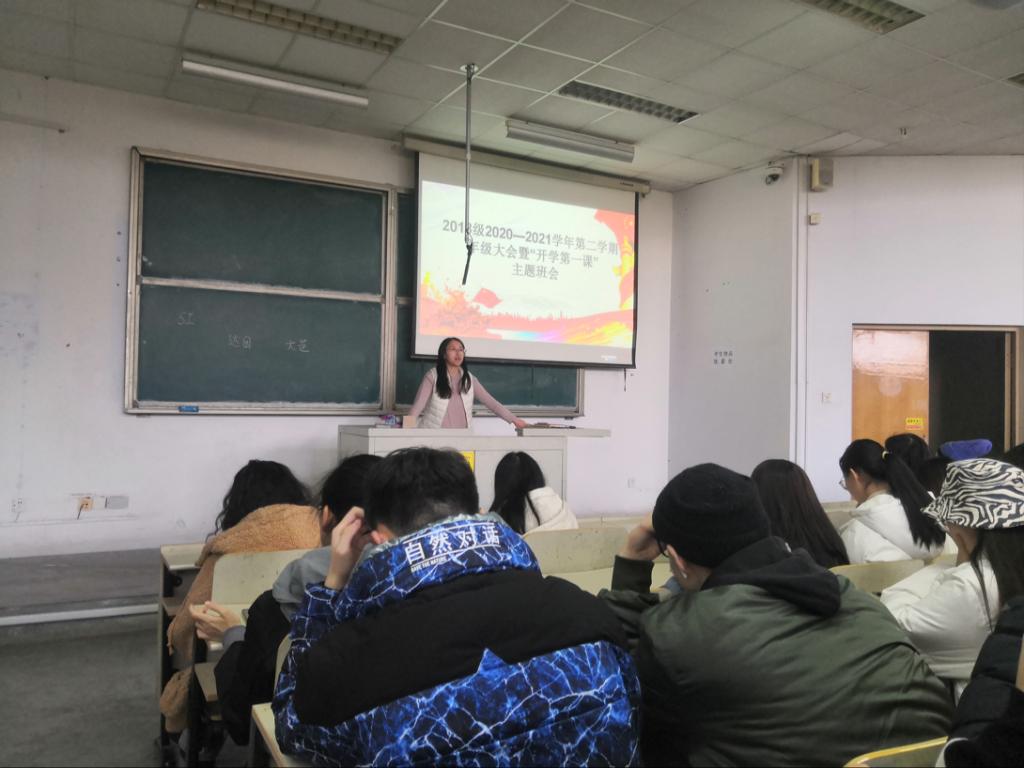 3月9日下午,2018级于明德楼412和弘毅楼403教室分别召开了“奋进百年,砥砺今朝——开学第一课”主题班会,会议由辅导员高守朋、张晓帆主讲。