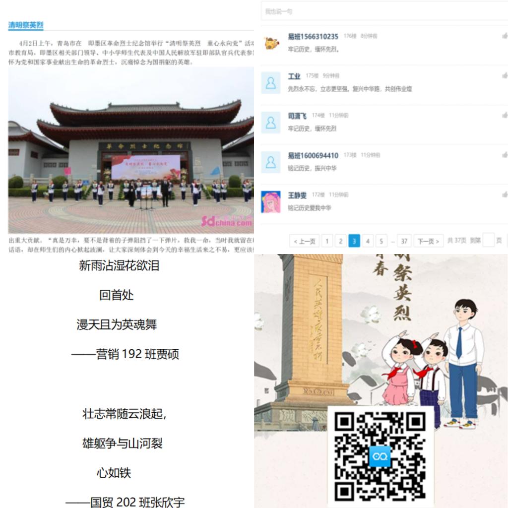 万里长空忠魂舞,英雄风骨尚凛然。当好英雄故事的传播者,不仅是对革命先烈的深切缅怀,也是对党史学习的深化。熊猫体育易班工作站于清明节来临之际发布快搭,鼓励同学们积极参与传统节日,网上祭英烈。此次活动帮助同学们更加了解清明节这一传统节日的演变和主要习俗,深入探讨了清明中承载的中华民族独特的精神与共同记忆,搭建了将党史学习和缅怀英烈相融合的桥梁。快搭中更设置了评论版块,为经管学子提供了抒发情感,寄托哀思的途径。同学们更是通过三行诗和网页H5的创作让红色种子在心灵深处生根发芽,用我们的初心使命解锁我们党“从哪里来”“向何处去”的精神密码。