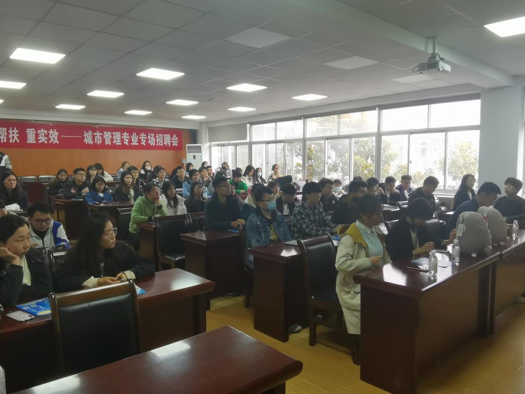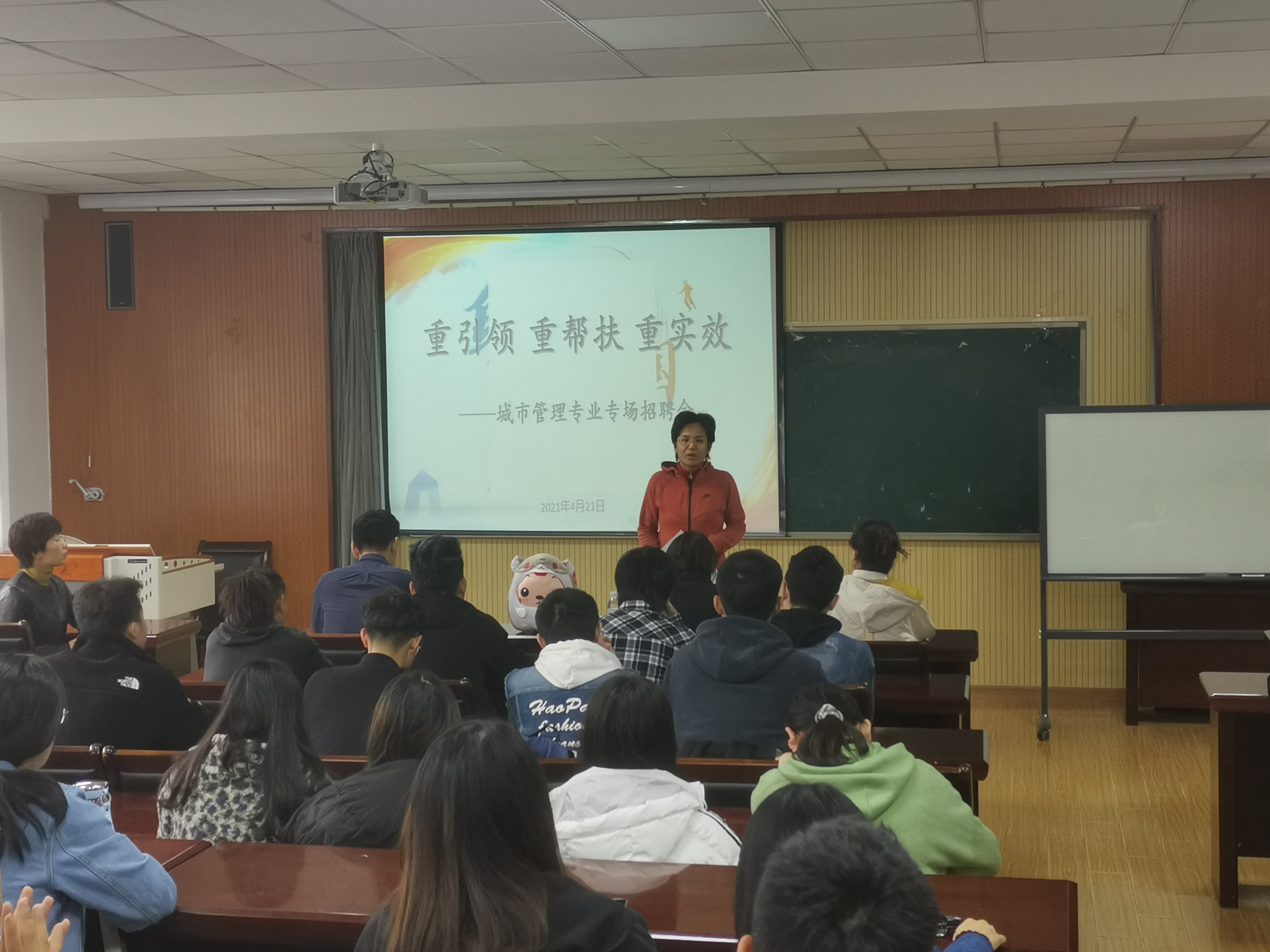 4月21日下午,城市管理专业在经管楼419举办专场招聘会,公司副经理宫攀、城市管理系主任万婕以及城市管理系17级、18级全体同学参加活动。