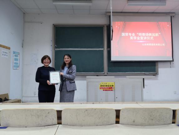 本次活动主要分为三部分,分别是奖学金宣讲仪式、比赛团队及2017级4位学长学姐的经验分享。在奖学金宣讲环节,山东明德造纸有限公司李明兰讲述了公司的基本情况以及奖学金设立的初衷。她表示,奖学金不仅是对获奖员工的奖励和肯定,更是一种激励和鞭策,希望国际贸易专业的学子们不断进步、志存高远、心怀家国,日后努力回馈社会。