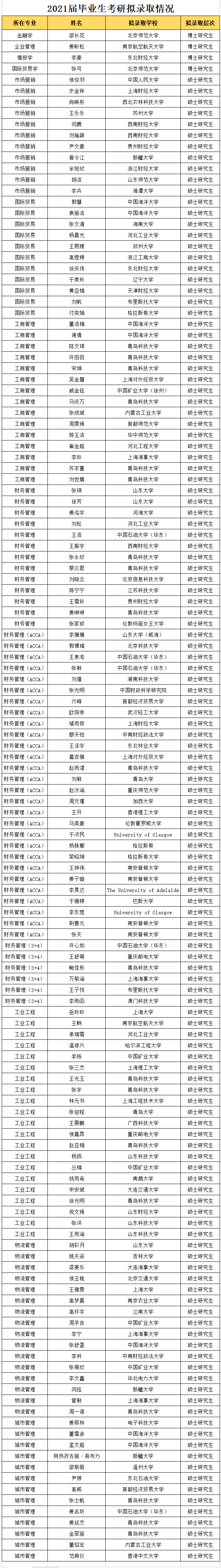 2021年全国硕士研究生录取工作接近尾声,在公司领导和老师的关心、指导以及同学们的不懈努力下,熊猫体育捷报频传,截至目前,公司2021届硕士研究生有4人成功考取博士研究生,2021届本科生中有134人被中国人民大学、山东大学、上海财经大学等知名高校录取为硕士研究生,本科生总体升学率达26.43%(国内升学率22.68%)。升学录取名单如下: