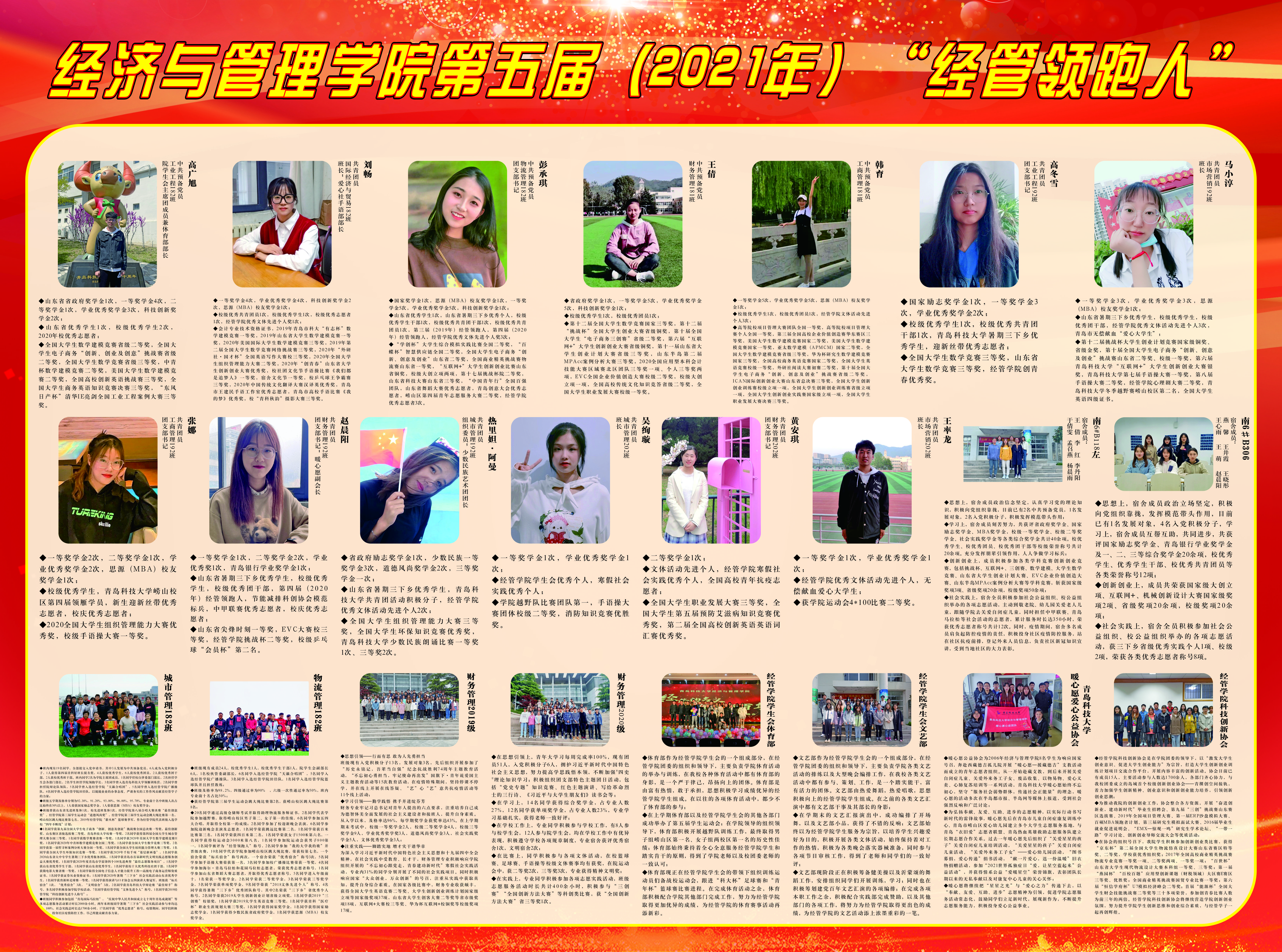 为迎接中国共产党建党100周年,引导广大青年学子坚定理想信念,厚植爱国情怀,做有理想、有责任,有担当的新时代青年,熊猫体育特开展“展现青春风采,谱写奋斗乐章“之寻找“第五届(2021年)经管领跑人”活动。