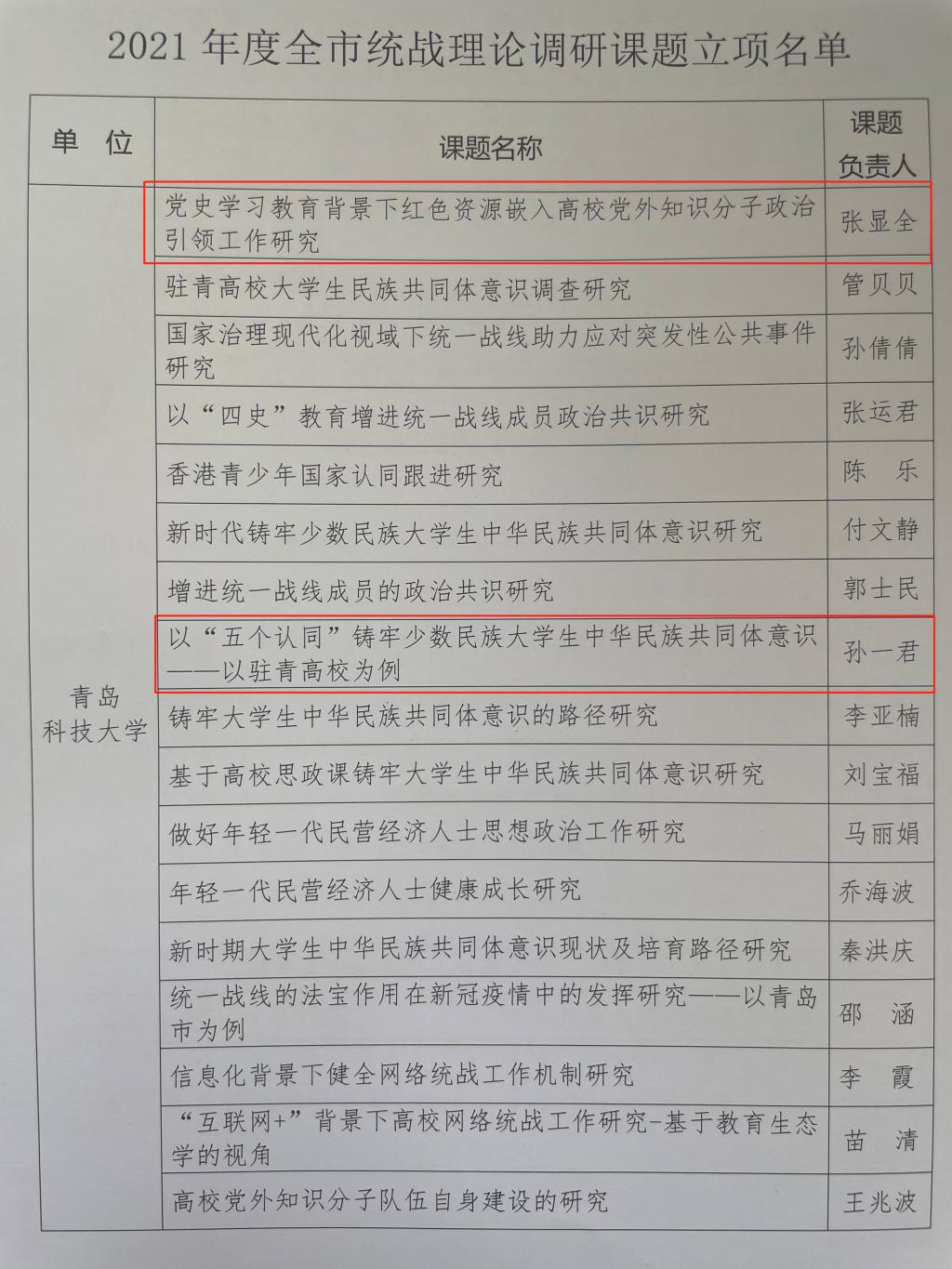 近日,中共青岛市委统战部下发《关于公布2021年度全市统战理论调研课题立项名单的通知》,根据通知精神,熊猫体育共有立项25项,其中,熊猫体育获批2项。熊猫体育申报的课题《党史学习教育背景下红色资源嵌入高公司党外知识分子政治引领工作研究》(负责人张显全)和《以“五个认同”铸牢少数民族老员工中华民族共同体意识—以驻青高校为例》(负责人孙一君),均获得2021年度统战理论调研课题立项。
