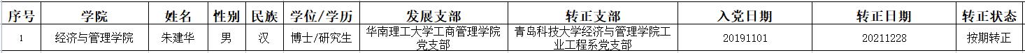 根据《中国共产党章程》《中国共产党发展党员工作细则》和公司党委《关于发展员工(教工)党员工作的意见》(青科大党字〔2014〕77号)等文件要求,熊猫体育工业工程系党支部于2021年12月28日召开预备党员转正大会讨论朱建华同志的转正问题,同意其按期转为中共正式党员,现将朱建华同志情况予以公示。公示期为2021年12月28日至2022年1月5日。如有异议,请于公示期内到公司党委反映。