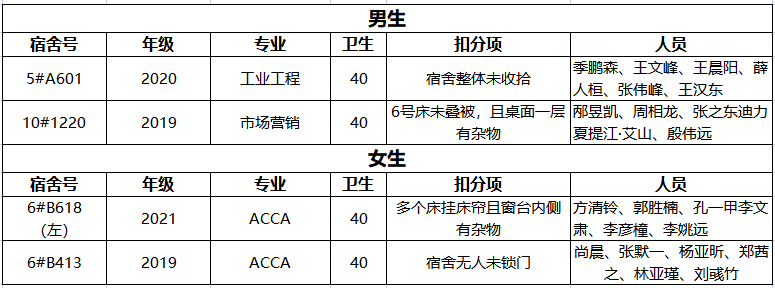卫生检查结果及扣分细则请见附件,请各年级对照问题监督好不合格宿舍的整改。