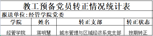 根据《中国共产党章程》《中国共产党发展党员工作细则》和公司党委《关于发展员工(教工)党员工作的意见》(青科大党字〔2014〕77号)等文件要求,熊猫体育城市管理与区域经济系党支部于2022年6月14日召开预备党员转正大会讨论蒋明慧同志的转正问题,同意其按期转为中共正式党员,现将蒋明慧同志情况予以公示。公示期为2022年6月14日至2022年6月20日。如有异议,请于公示期内到公司党委反映。