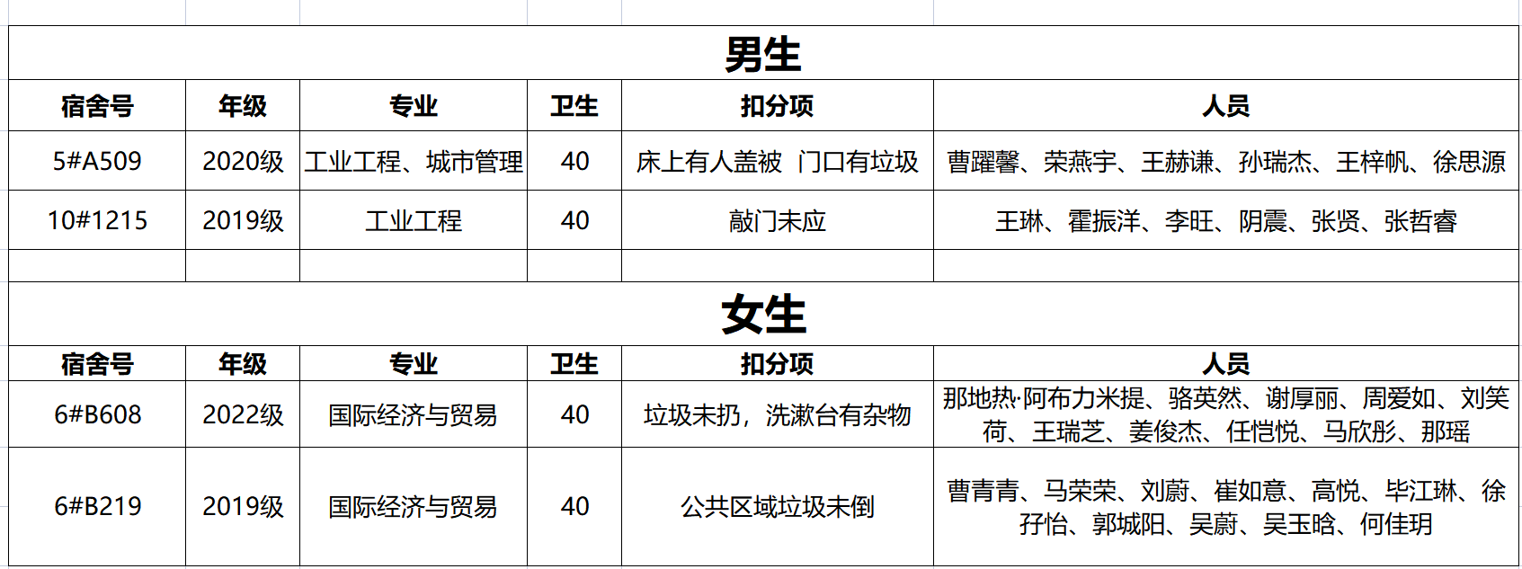 卫生检查结果及扣分细则请见附件,请各年级对照问题监督好不合格宿舍的整改。