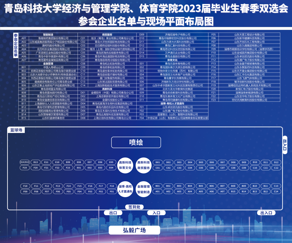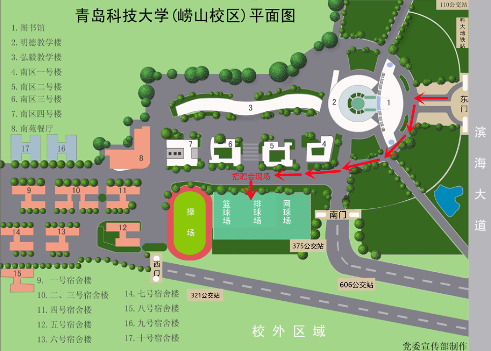1.请参会企业于招聘会当天上午8:50之前到报道地点进行签到。招聘会位于山东省青岛市松岭路99号熊猫体育崂山校区弘毅广场外篮球场,建议乘坐公共交通工具到校,自驾车请从东门(松岭路)入校,入校后左拐,直行500米左右,即可到达报道地点。车辆请按指定位置停放。