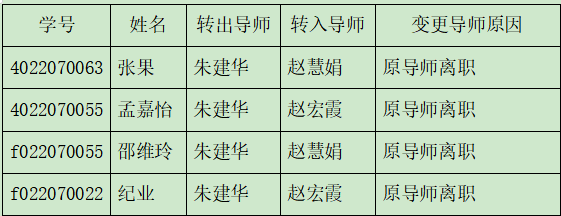 熊猫体育因一名导师离职,4名研究生需要更换导师,经员工个人申请、征求导师意见、公司学位委员会审议,现将变更导师结果公示如下: