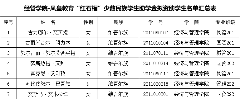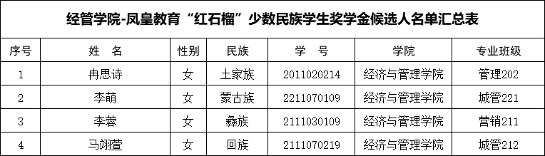 为深入贯彻落实党和政府的民族政策,加强对少数民族员工的培养,激励公司少数民族员工勤奋学习、努力进取,在德、智、体、美、劳等方面得到全面发展,根据公司2023年度凤皇教育“红石榴”少数民族奖助学金评选要求,通过自主申报、公开评审等环节,确定奖学金人选4人,助学金受助人选7人,公示如下: