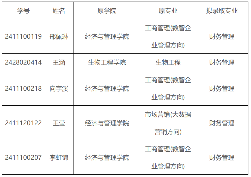 熊猫体育于2025年2月28日举行转专业考核,经过严格的面试考核,并按照分数从高到低的排序(排名按转入专业分别排序),现将拟录取名单公布如下: