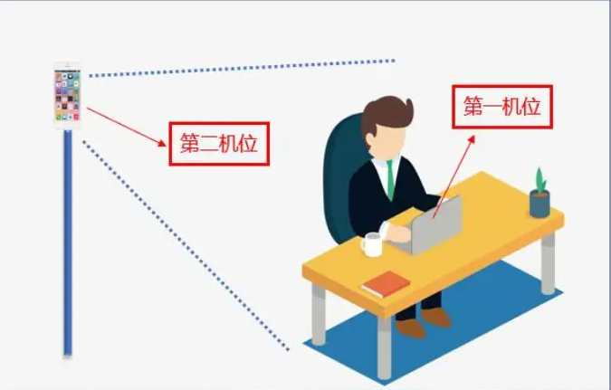 (五)远程复试通过腾讯会议进行,参加远程复试的员工,须提前准备两台设备,两个手机号(用以登录两个腾讯会议账号),第一台为主设备(建议笔记本电脑),要求放置在考生座位正前方,视频监控范围应保证考生在坐姿状态下能够完整清晰覆盖头部到桌面位置,以方便系统进行人脸识别、身份验证和考生查看试题;另一台为辅助设备(建议手机并用手机支架固定),用于背面监控及拍照上传试题答案,放于考生右后方45度位置,确保监控范围覆盖第一台设备的显示屏幕和考生本人头部、背部、手部(如下图所示)。请保证网络畅通并提前半小时进入会议进行测试,会议号将通过复试系统发布(提前一天),请考生自行登录查看。