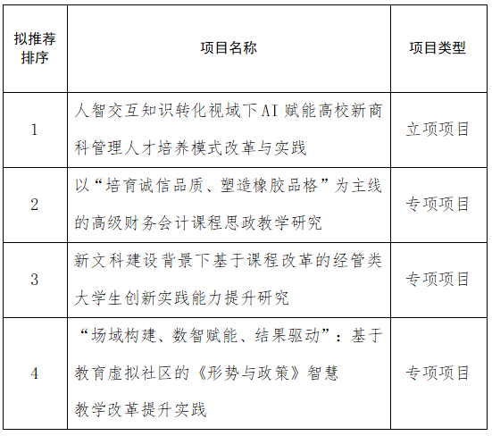 根据教务处《关于开展2025年度校级本科教学改革研究项目和专项项目申报及2024年度项目结题工作的通知》的相关要求,公司开展了2025年度校级教改项目立项申报推荐工作,经专家评审,推荐名单如下,公示期3天,反馈电话88958952。