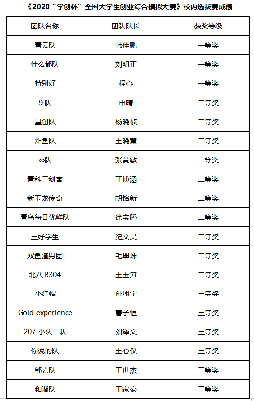 根据山东省教育厅《关于组织参加第八届“学创杯”全国老员工创业综合模拟大赛山东省省赛的通知》(鲁教高处函〔2021〕9 号)通知要求,公司于2021年5月25日至29日举行了创业综合模拟大赛、营销专项赛校内选拔赛,现将比赛结果进行公布。根据省组委会要求,创业综合模拟大赛、营销专项赛校内选拔赛一等奖的团队将代表公司参加山东省赛。