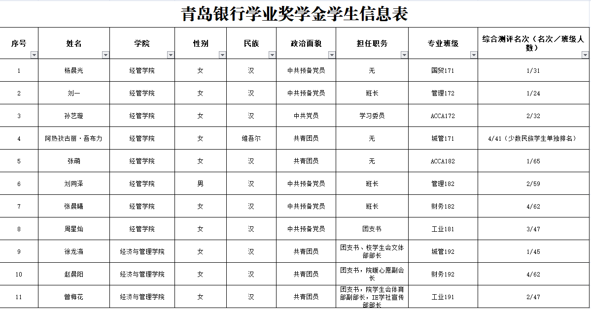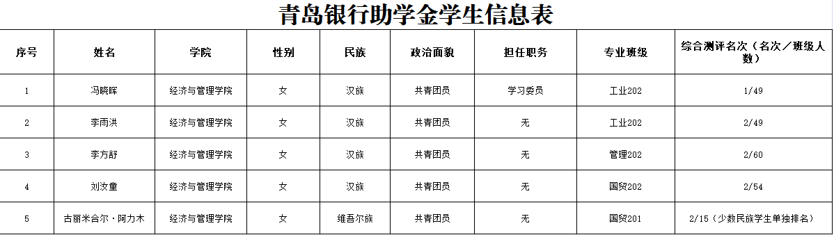 根据公司《2020年度青岛银行奖助学金的通知》的要求,经个人申请、材料审核,结合前期奖助学金获得情况,现对青岛银行奖助学金获得者予以公示,公示期3个工作日,公示时间2021年3月31日-2021年4月2日。