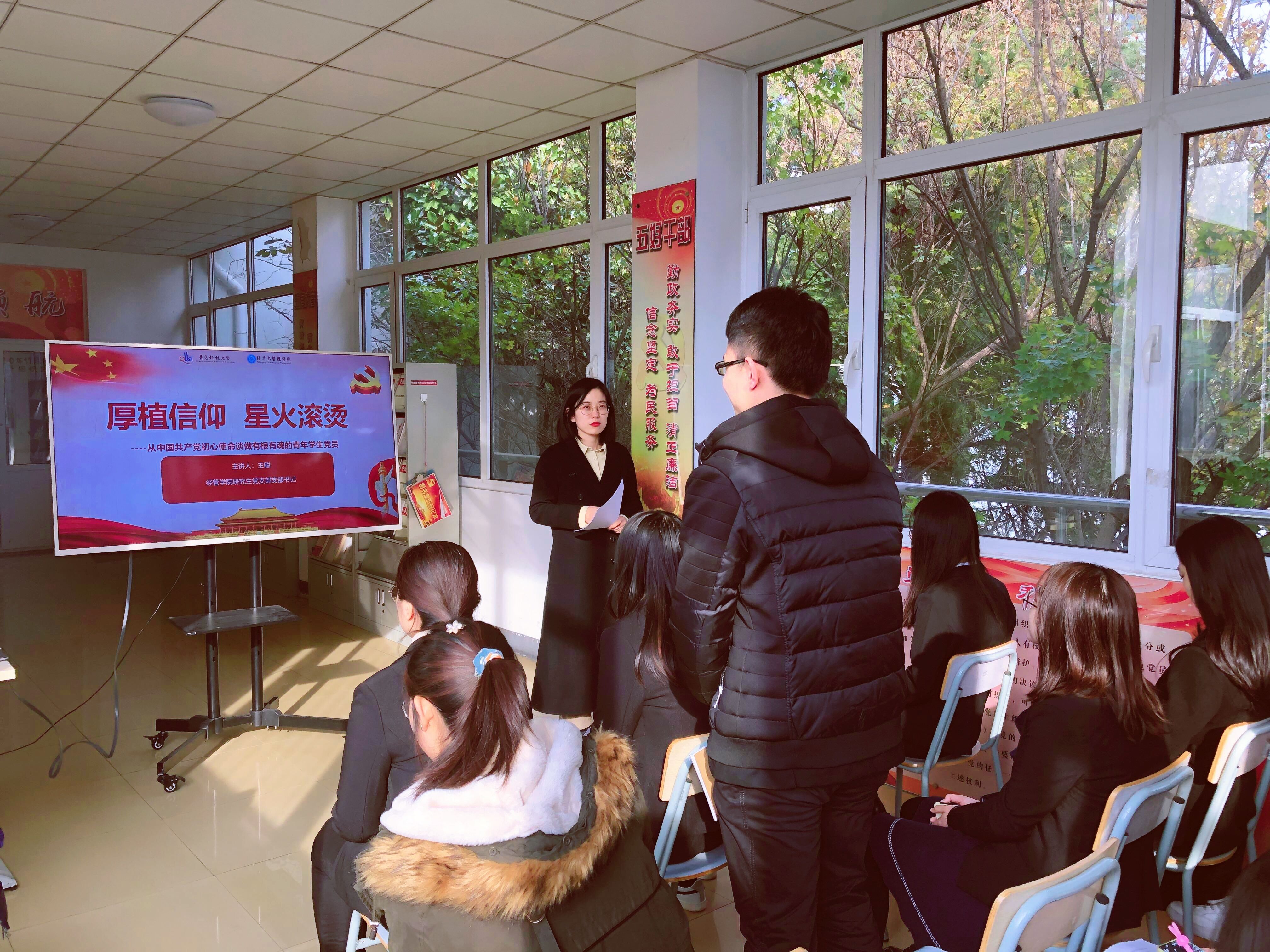 星火汇初心,青春肩使命。熊猫体育研究生党支部书记王聪以“厚植信仰、星火滚烫”为主题,以十九届五中全会及“四史”教育中红色资源为依托,以“党的旗帜、党的历史、党的擘画”三个方面为切入点,重点阐述了马列主义、毛泽东思想、邓小平理论、“三个代表”重要思想、科学发展观、习近平新时代中国特色社会主义思想等理论内涵,讲述了中国共产党的发展历程和辉煌成就,从中国共产党的初心使命谈做有根有魂的青年员工党员,并在如何提高党性、如何做好党员先锋带头作用、如何将个人发展融入祖国新时代发展建设中做出引导启迪。同时,王聪以浅谈初心使命为契机,激励青年党员加强思想淬炼和政治历练,强化理想信念教育和对党忠诚教育,增强“四个意识”、坚定“四个自信”、做到“两个维护”,在贯彻落实习近平总书记重要讲话、重要批示精神的生动实践中提升新时代党员政治素养、理论水平、专业能力、实践本领。