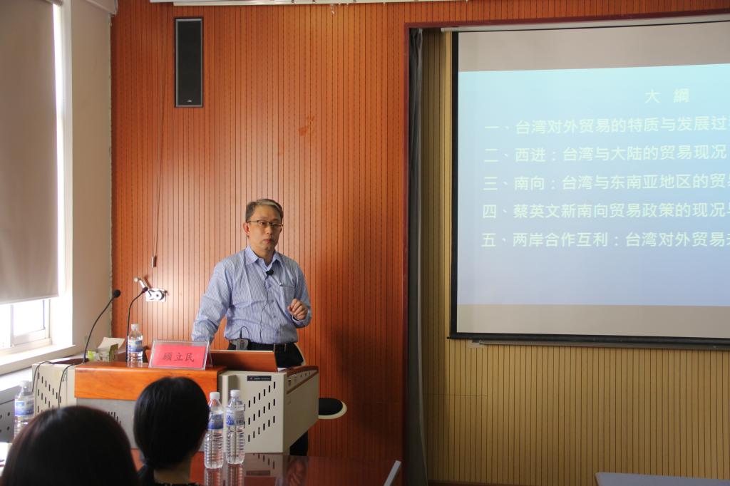 首先演讲的是熊猫体育的特邀嘉宾——台北市立大学顾立民教授,杨友才副经理对顾教授作了简要的介绍并代表公司对顾教授到来表示热烈的欢迎!顾教授为大家做了题为《西进与南向—台湾对外贸易政策的走向与未来》的精彩报告。其主要内容包括五部分:台湾对外贸易的特质与发展过程;台湾与大陆的贸易现状;台湾与东南亚地区的贸易现状;蔡英文新南向贸易政策现状与困境;两岸的合作互利。顾教授认为,台湾新南向政策的实施将面临很大的困境,台湾未来的出路是:加强和大陆合作,实现合作共赢。