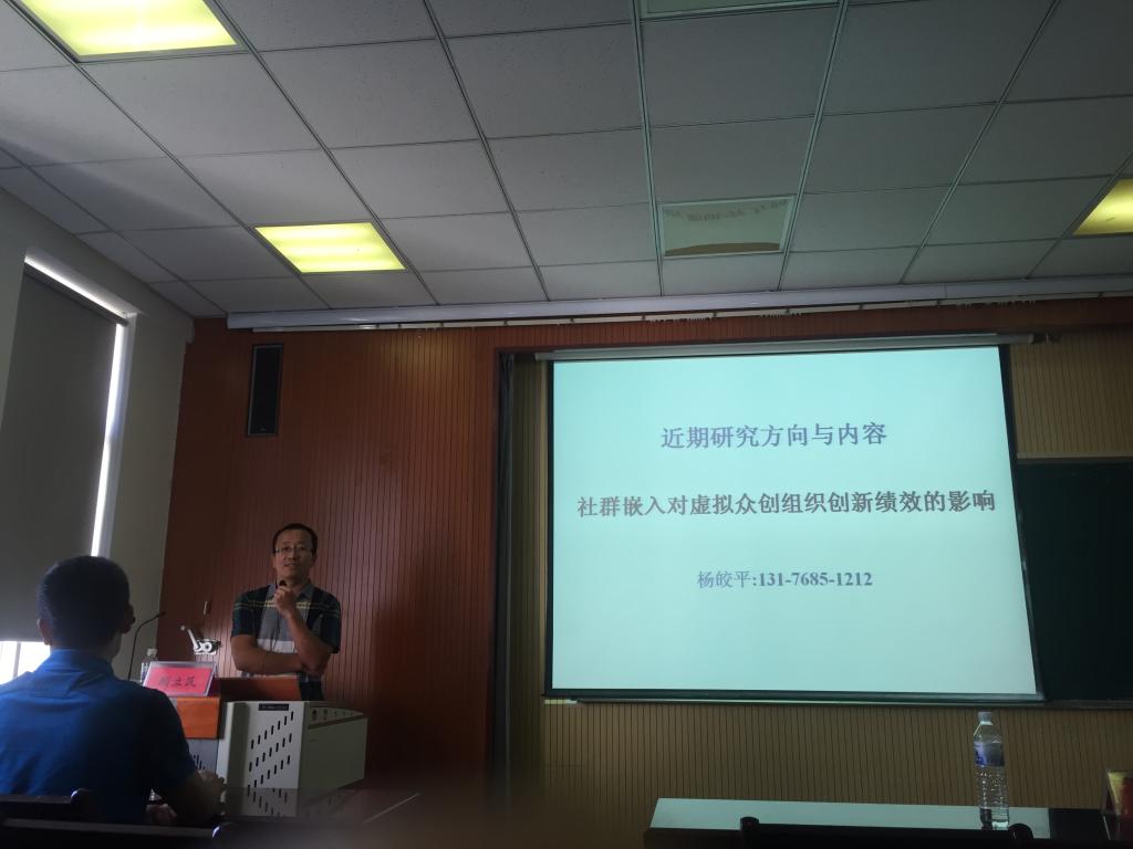 最后,熊猫体育杨皎平老师做了精彩的演讲,他在简单介绍了其最近的“社群嵌入对虚拟中创组织创新绩效的影响”研究课题之后,与老师们分享了其课题申报的一些经验,为同学们解读了如何写好论文,提升科研能力。他认为,“团队合作”是如今科研人应具备的品质,并强调 “厚基础,知前沿”的重要性。
