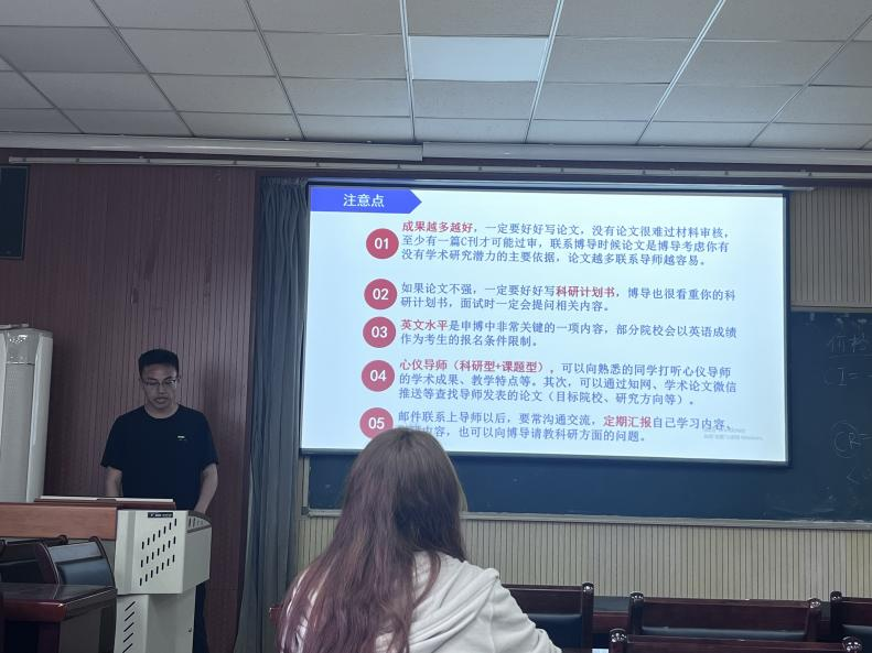 金铭慧提出申博之前务必谨慎,要想明白“为什么要读博”。随后介绍了申博需要准备的材料,强调了四六级成绩对申博的重要性。并建议研究生三年应提前做好规划,研一勤耕不辍,重视科研成果产出;研二注重参加学术会议并准备简历联系心仪导师;研三准备报考。