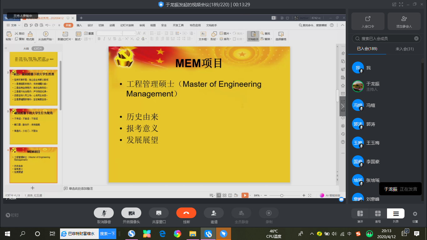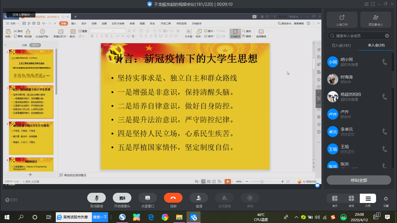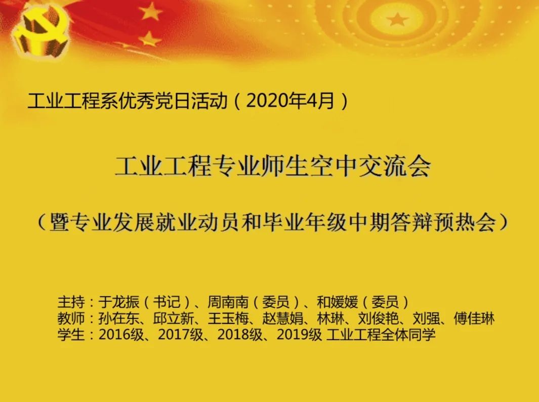 2020年4月12日晚,工业工程2016-2019级学子在全系老师的带领下,通过阿里钉钉开展了一次党支部优秀党日活动,这也是2020年全系师生开的第一次大会,本次会议主要围绕以下四个方面展开。