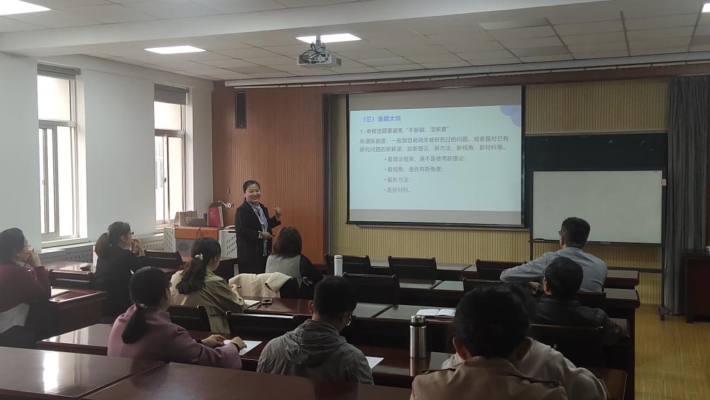 接着,张迎春老师结合自己在申报国家社科基金过程中积累的经验,第一点详细讲解了如何抓住政策导向确定选题,分享多方面选题角度,分享如何避免选题大坑;第二点归纳总结《指南》中注意事项并提出团队构建注意事项;最后一点细致的分享了申请书和活页的填写,包括:(1)封面(2)承诺和填写说明(3)填写《数据表》注意事项(4)数据表(5)课题设计论证(6)研究基础和条件保障(7)经费预算和推荐人意见(8)校、省级机构意见(9)评审意见(10)关于活页补充说明。