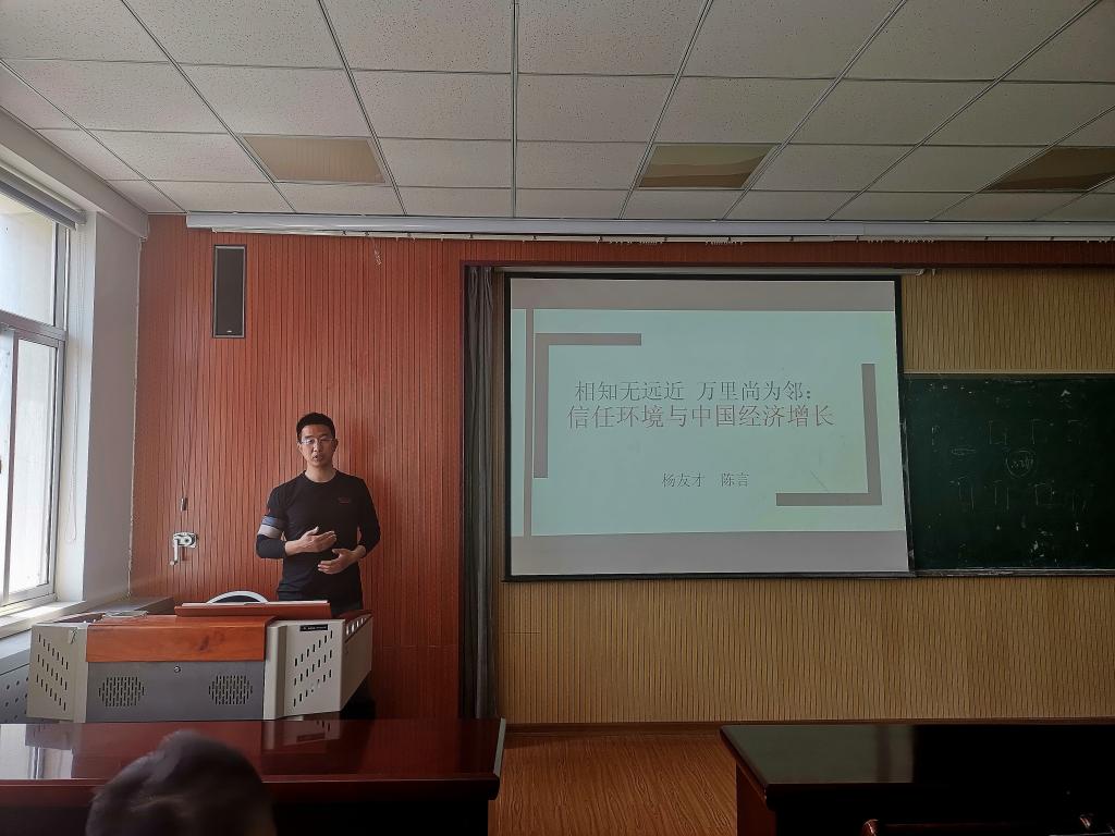 会议开始,杨友才教授首先向公司师生分享了一篇题为“信任缓环境与中国经济增长”的论文。杨教授研究制度经济学多年,擅长将经济学概念纳入数理模型中并进行合理的推导,此论文是一篇以抽象概念“信任”为主题的数理模型推导论文。首先,杨教授以一句古语“相知无远近,万里尚为邻”生动地引出了“信任”的背景,提出该论文的主要创新点是构建一个“信任环境”,分别研究该环境对个人收入和中国经济增长产生的影响。然后,他从数理模型推导和模型实证两方面出发,系统地阐述了论文的主要内容,使师生们更深入地了解该论文的模型构建过程和主要贡献。通过实证结果他发现,信任水平对人均收入和经济产出确实有显著的正向影响,因而在以后的研究中,我们应该充分考虑到信任因素的有效作用。