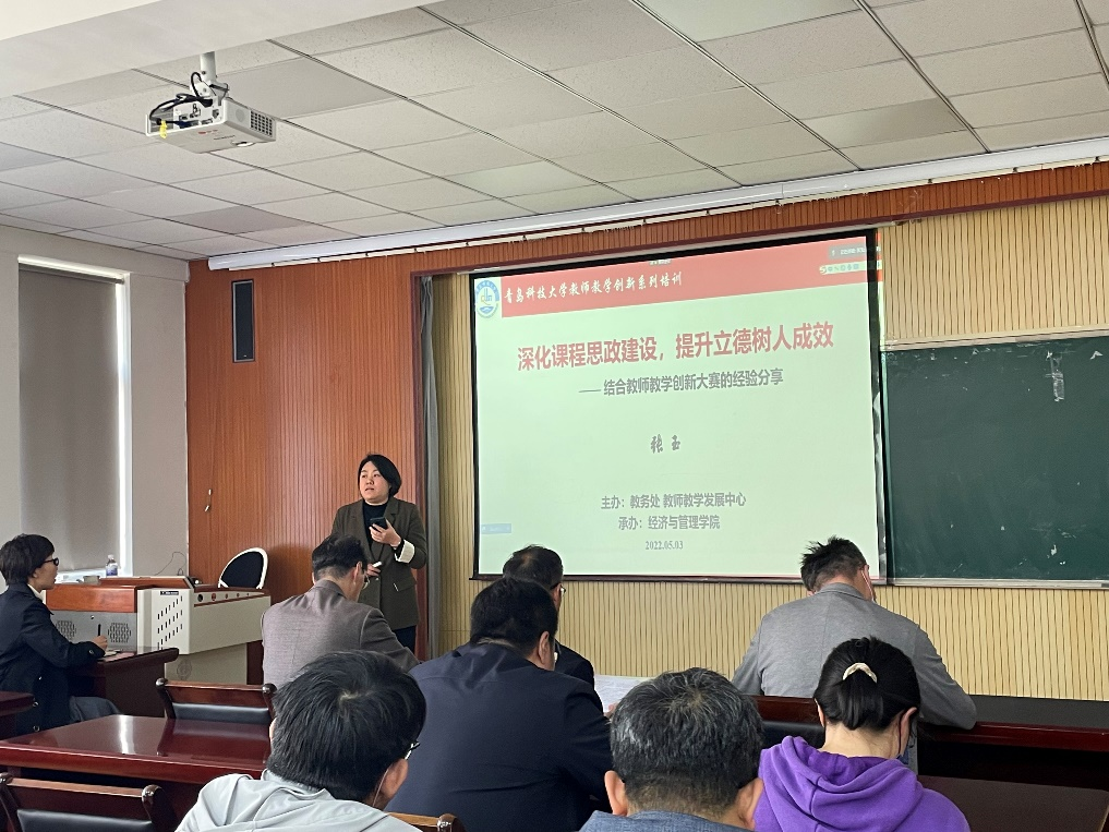 会上,张玉以自己讲授的《税收学》课程为例,结合自己的教学实践,从教学创新大赛与课程思政、课程思政实施过程、课程思政实施效果等四个方面进行了经验分享,从教学创新大赛评分表入手,详细分析课堂教学实录视频、教学创新成果报告和教学设计创新汇报中课程思政的重要性,建议教师们要根据自己的课程特点,围绕教学目标,深入挖掘思政元素,有机融合思政元素与教学内容,润物细无声地培养员工善于观察思考、敢于实践,勇于探索的精神。